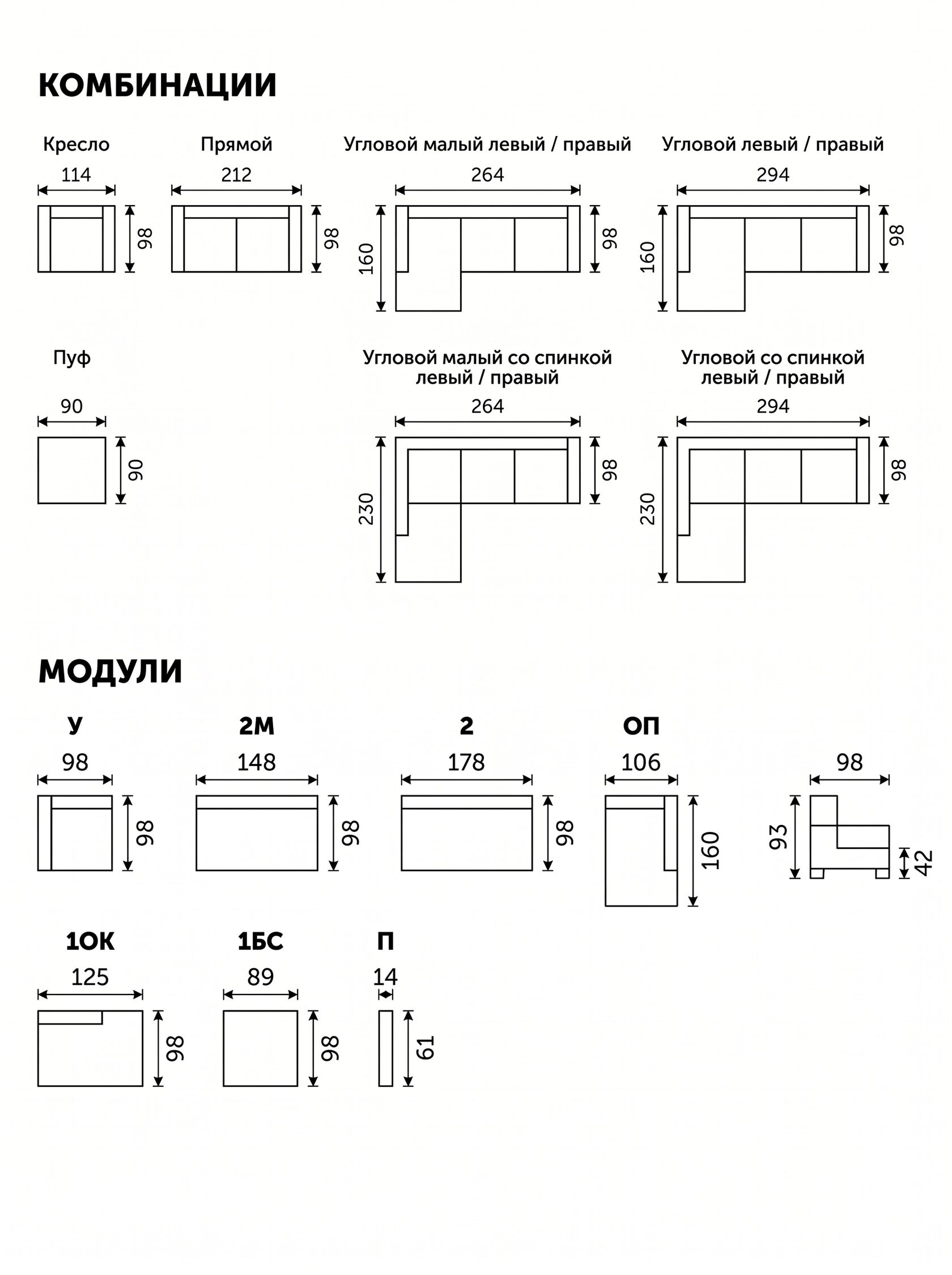 Большое количество модулей позволяет создавать диваны различных форм и размеров – как прямые, так угловые и П-образные.